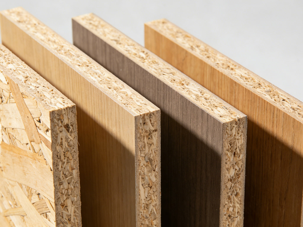 ENF级OSB(定向刨花板)已全面升级。它用大片松木刨片按纵横方向铺装热压成型,结构稳定、握钉力强、抗变形能力远超传统碎料刨花板。国家新标ENF级(≤0.025mg/m³)更是目前人造板甲醛释放量的天花板级别,母婴房墙面打底安心用